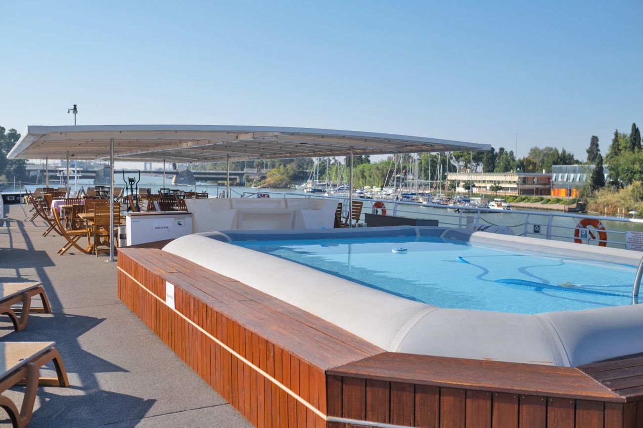 Най-горната палуба е с открита тераса с шезлонги и малък басейн.