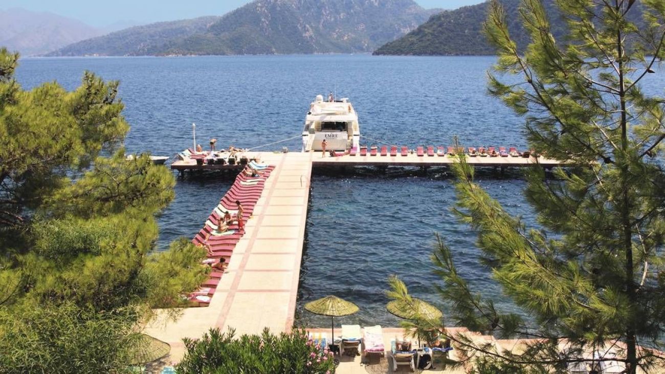 На 98 км. от летището в гр. Даламан, 6 км от центъра на Мармарис, 2 kм. от Ичмелер, на брега на морето със собствен плаж – изкуствена платформа опесъчена. последно реновиран през 2011 г.
