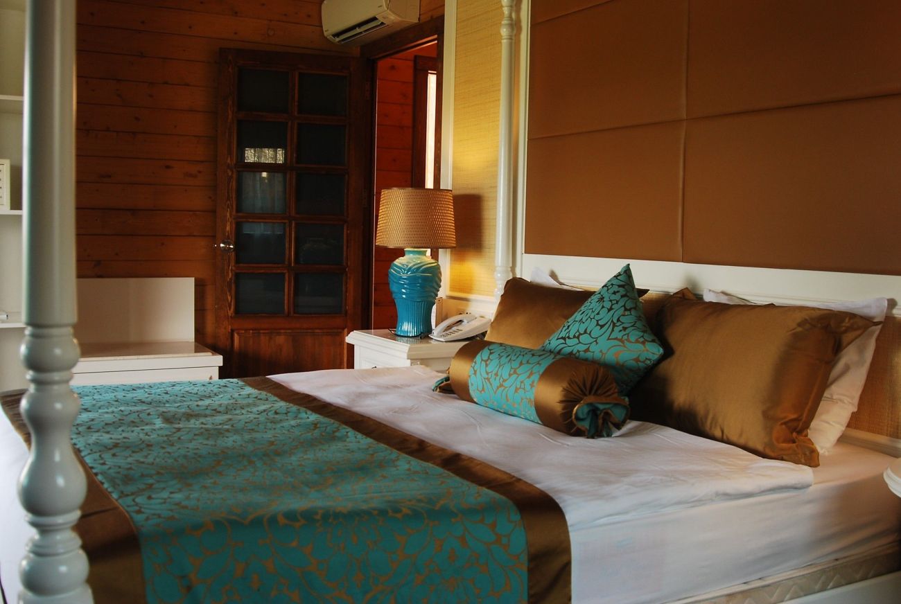 - Вила: 1 двойно легло и 2 единични легла в 2 стаи с разделителна врата с платформа частен плаж и басейн надолу по стълбите от вътрешния двор на вилата. Също така разполага със самостоятелна сауна с капацитет от 1 човек на употреба (с доплащане).