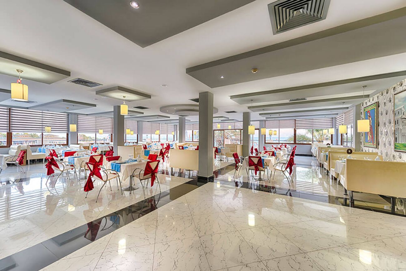 Основен ресторант с отворен бюфет, 3 а ла карт ресторанта - рибен, италиански, турски. Общо 8 бара, включително релакс басейн, бар на основния басейн, бар на плажа.