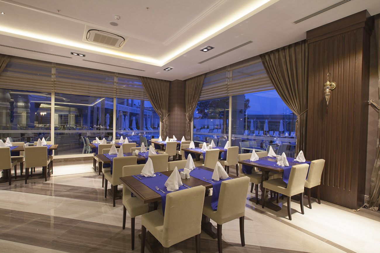 Основен ресторант с отворен бюфет, турски и италиански а ла карт ресторанти, лоби бар, бар край басейна, бар на плажа, снек бар, дискотека.