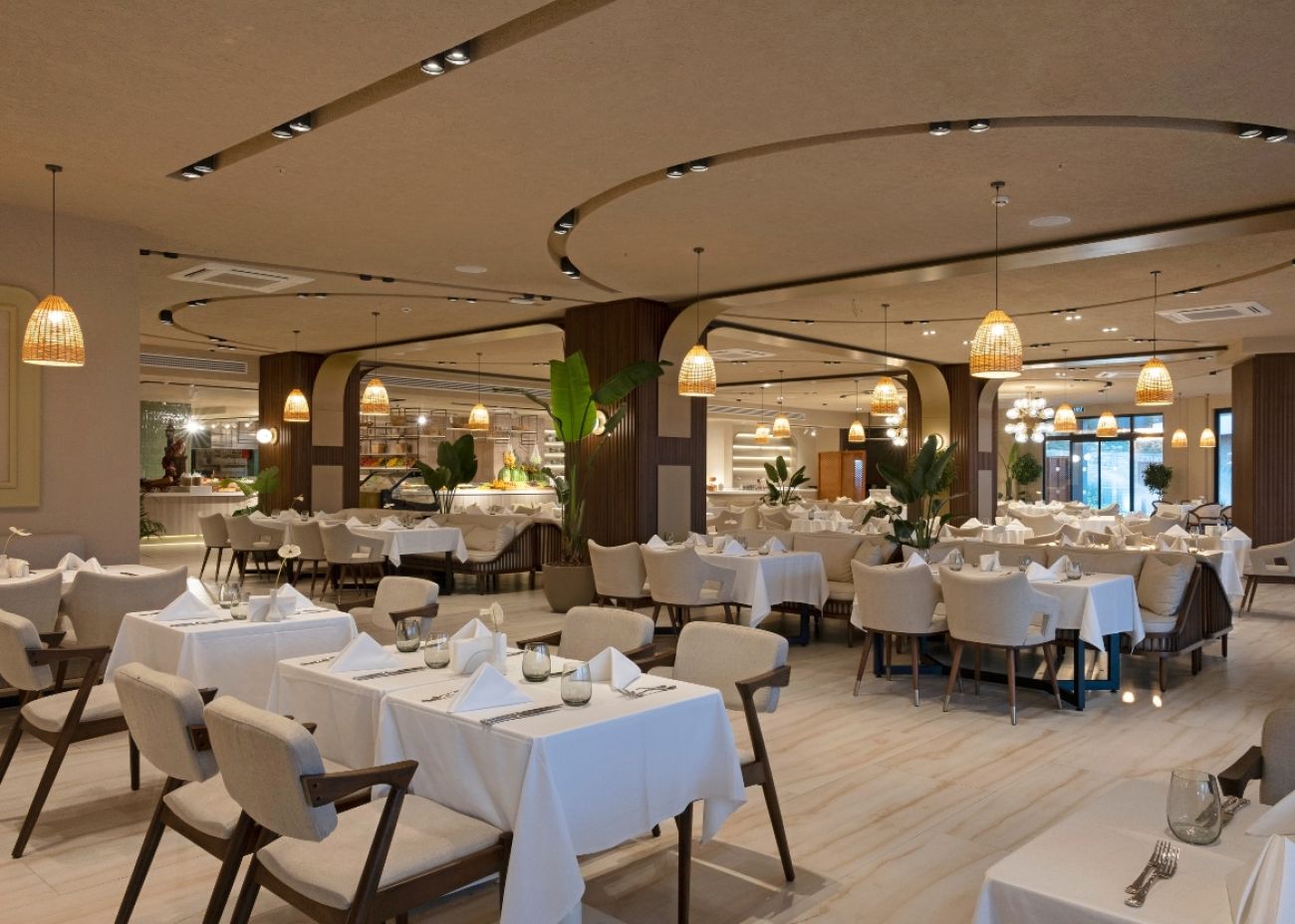 Основен ресторант - отворен бюфет. А ла карт ресторанти - ROUGE ROOF за турска кухня, MARE за морска, възможност за специална вечеря на плажа (с доплащане). Лаундж и тераса бар, бар край басейна, кафене, бар на плажа, бар към детския клуб в аквапарка.