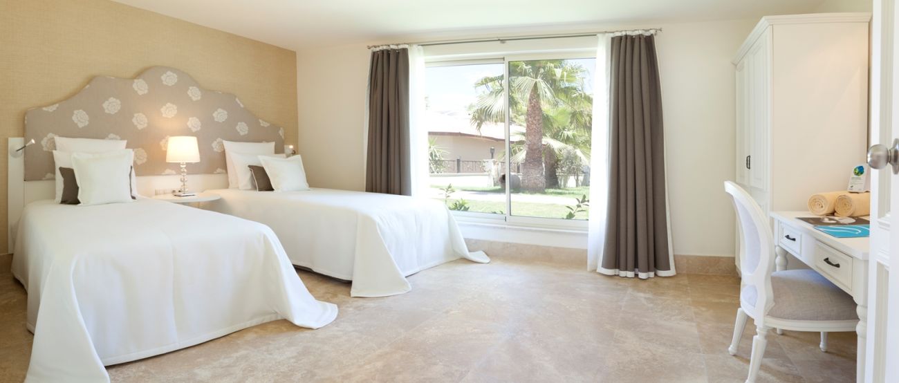Стандартните стаи са 30 кв. м. с балкон и изглед градина, разполагат с двойно или 2 единични легла, и разтегателен фотьойл.