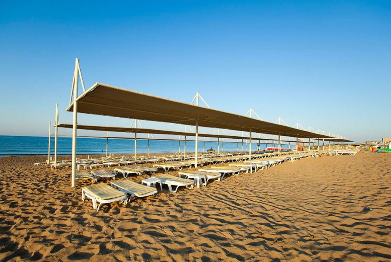 собствен пясъчен плаж с дължина 200 метра. Чадъри, шезлонги, матраци, хавлии – безплатно.