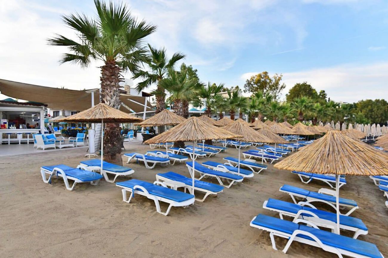 Собствен пясъчен с безплатни шезлонги, чадъри, матраци и кърпи.