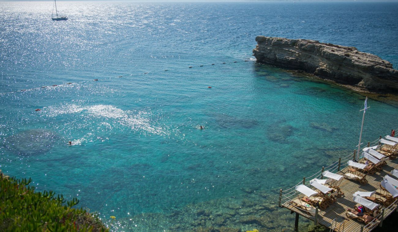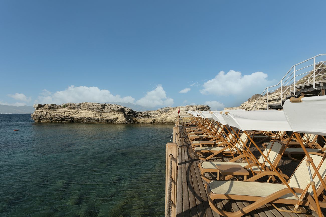 Собствен пясъчен плаж с малки камъчета и на платформа. 2 кея и бар, безплатни чадъри и шезлонги.