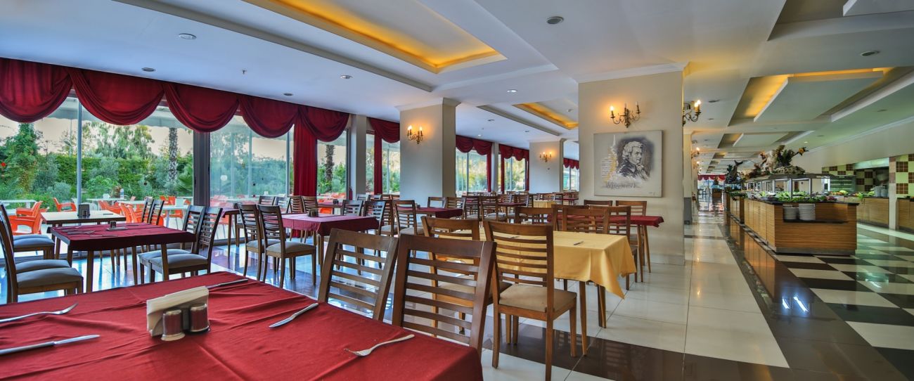 Основен ресторант, турски а ла карт ресторант, рибен и барбекю ресторант. Лоби бар, бар на басейна, снек бар, бар на плажа, витаминен бар.