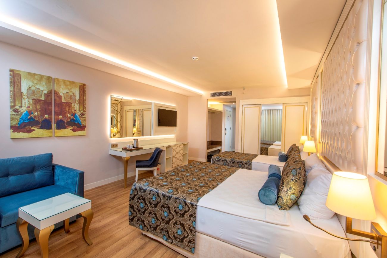 592 стаи с тераси, сателитна ТВ, телефон, сешоар, сейф, климатик, кафе машина, мини бар, интернет. Стандартните стаи са с площ от 26 до 32 м2 и максимално настаняване 2 + 1 дете, изглед градина, басейн или море. Супериорните стаи са 34 до 38 м2 и максимално настаняване 3 + 1 дете и 1 бебе. Фамилни стаи тип А - 39 до 47 м2 с 1 баня за 4 + 1 дете, Фамилни стаи тип В - 47 до 64 м2 с 2 бани за 4 + 1 дете, Фамилни стаи двойни - 43 до 78 м2 с 2 бани за 4 + 1 дете.