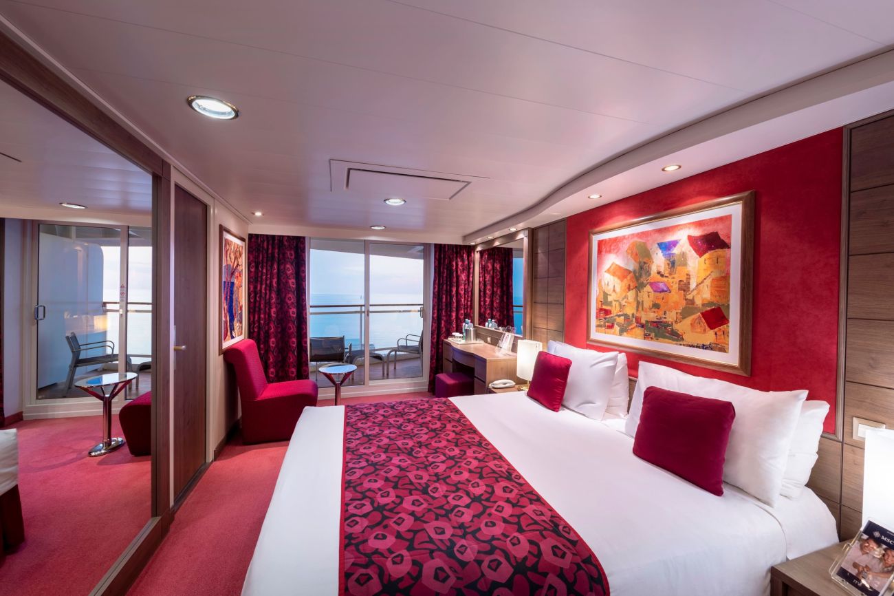 Суити и апартаменти, каюти с балкон, каюти с прозорец /не се отваря/, вътрешни каюти, каюти за инвалиди. Всички със сателитна ТВ, телефон, сейф, сешоар, климатик, минибар, интернет и рум сървиз срещу заплащане. Повечето разполагат с диван, който се превръща в трето легло или 2 легла едно над друго за настаняване на 2 деца.