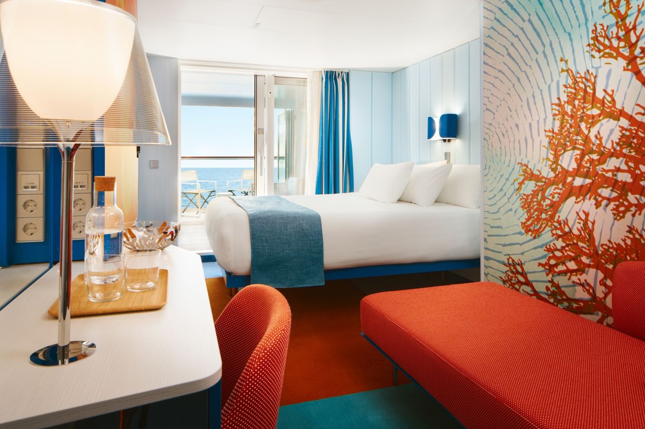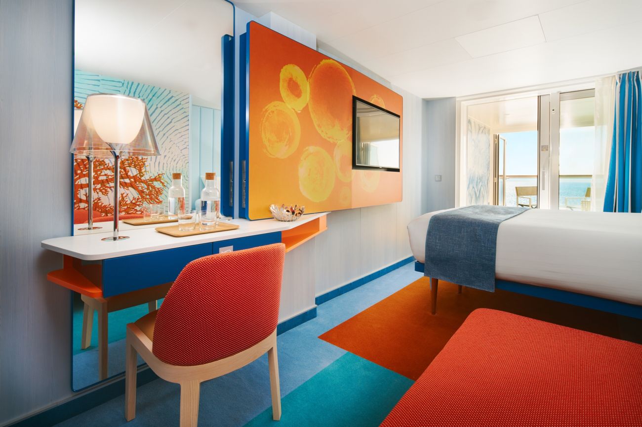 Каюти с балкон, каюти с тераса над морето, суити, каюти с прозорец / не се отваря /, вътрешни каюти, каюти за инвалиди. Всички с интерактивна ТВ, телефон, сейф, климатик, сешоар, интернет срещу заплащане.