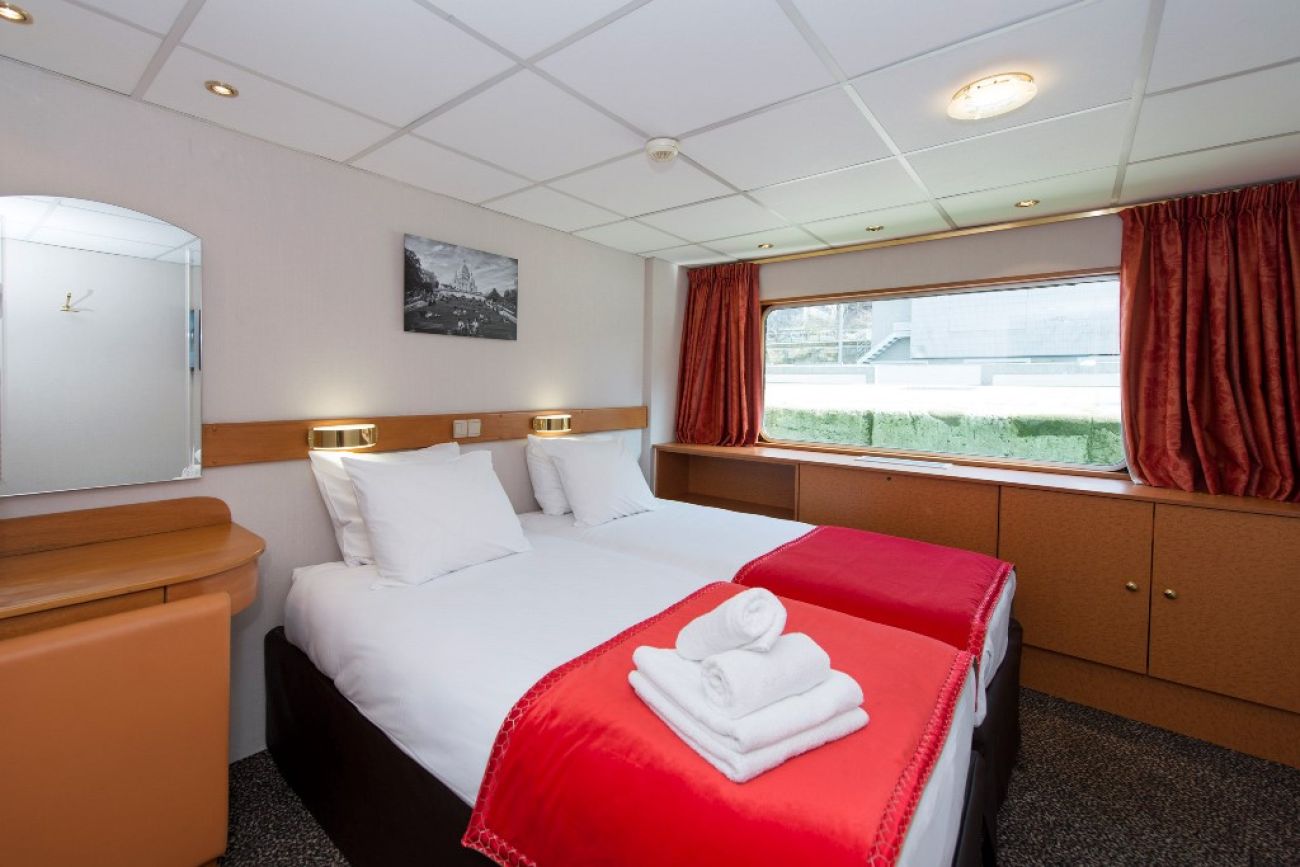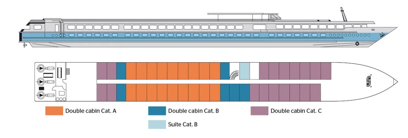 Каютите са общо 67, разпределени на 2 палуби, с площ около 12.50 кв. м. На основната има общо 43 каюти с прозорец. На горната палуба се намират 24 кабини с отварящи се в горната част (плъзгащи) прозорци.
