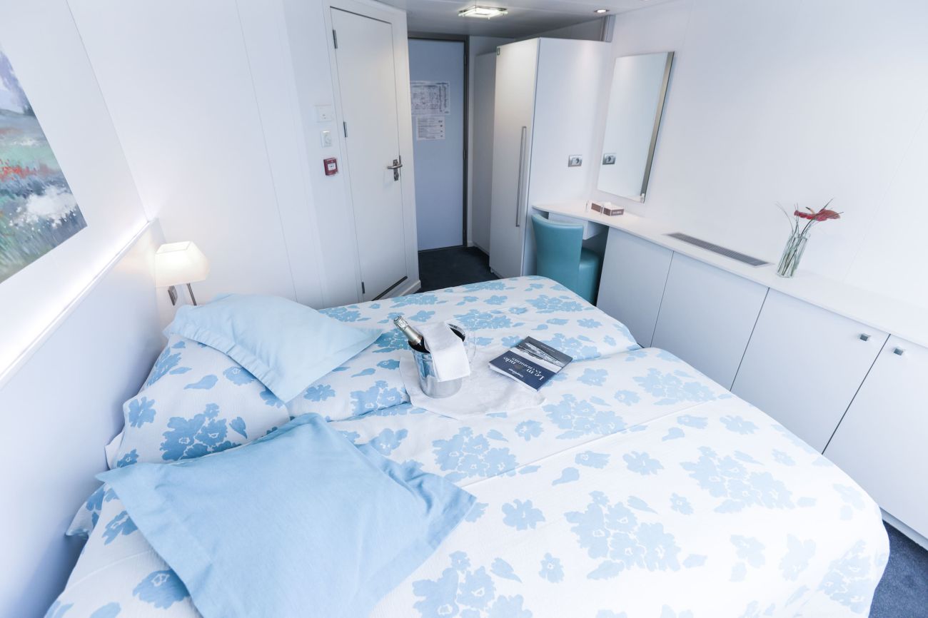Може да избирате между 87 двойни каюти, разположени на 3 палуби – висока, средна и основна. Каютите на високата палуба са с френски прозорци, на средната палуба са с по-малки прозорци. На основната палуба каютите са с илюминатор. Разполагат с 2 единични или 1 двойно легло, баня и тоалетна, телевизор, климатик, сейф, безжичен интернет. Каютите са с площ между 11 и 13.50 кв.м.