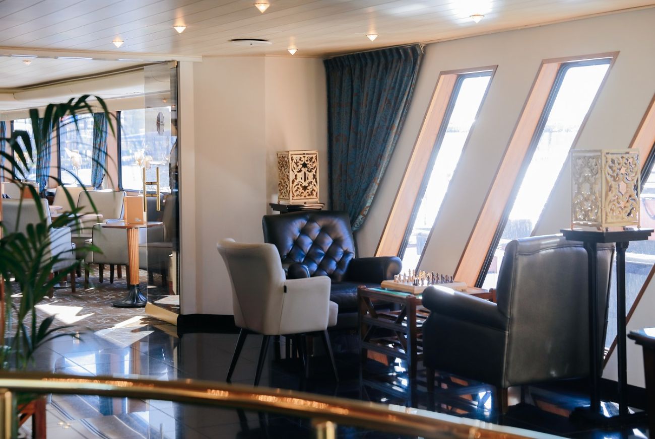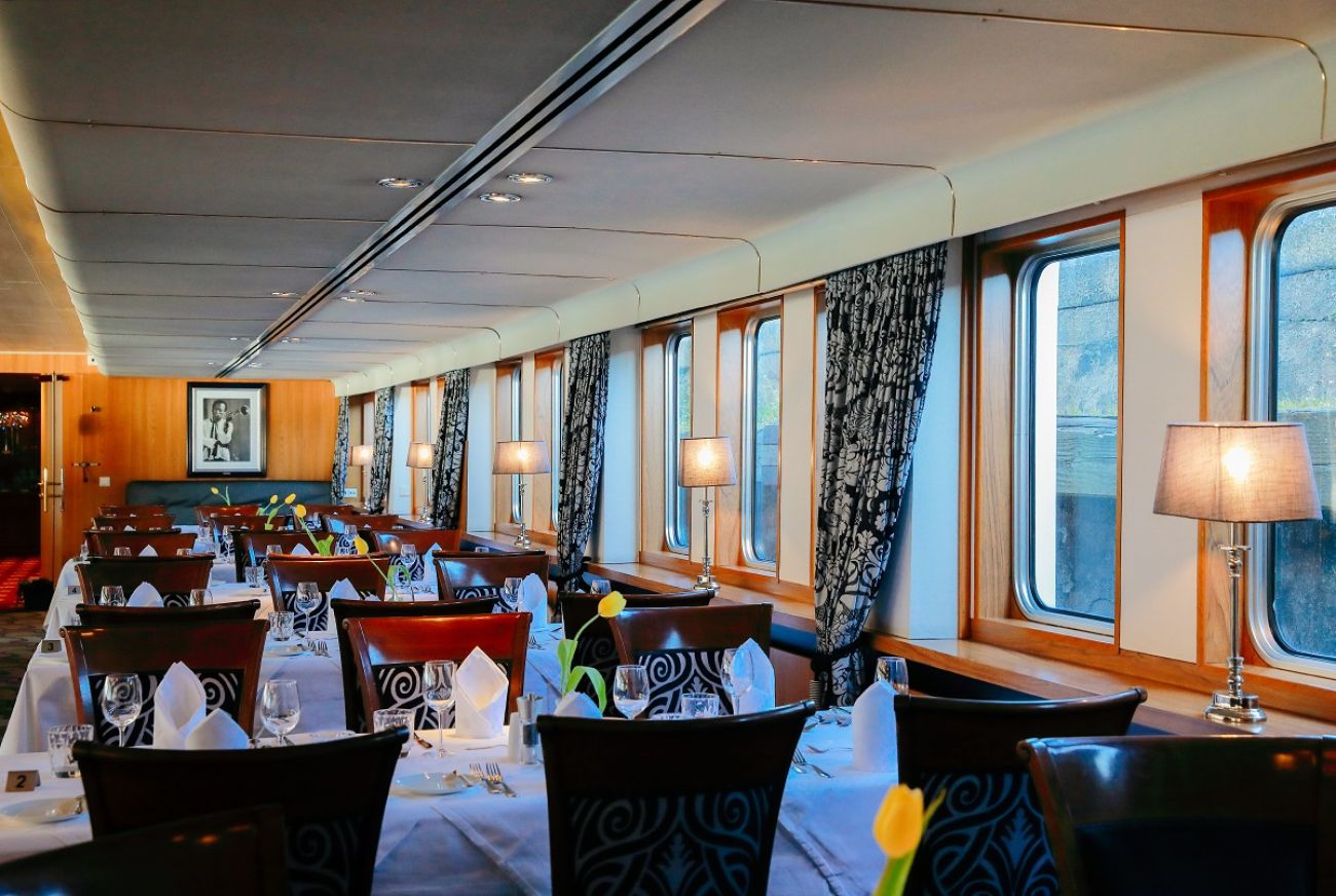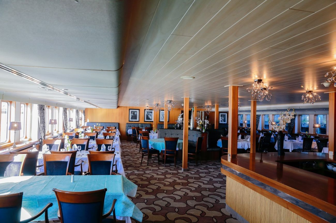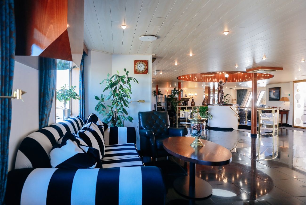 На разположение на гостите са ресторант, бар, зона с камина и кресла, машина за кафе и чай на самообслужване през целия ден, библиотека, сауна и фитнес, слънчева тераса със шезлонги, безжичен интернет срещу заплащане. Корабът разполага с 3 палуби, капацитетът е 110 гости.