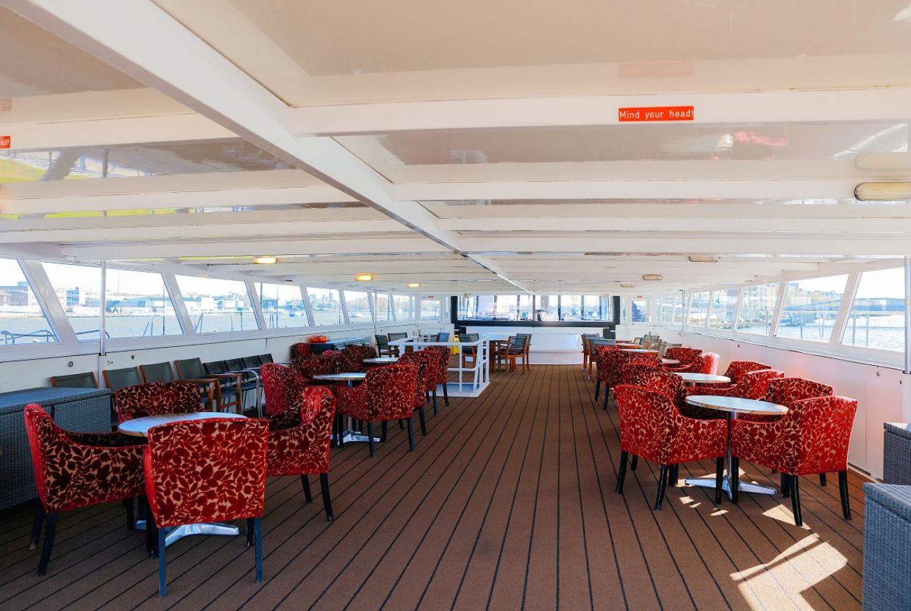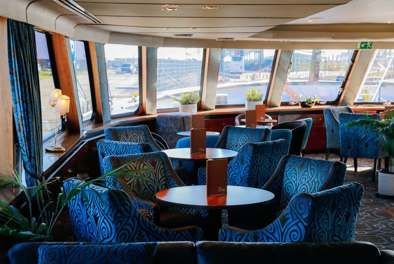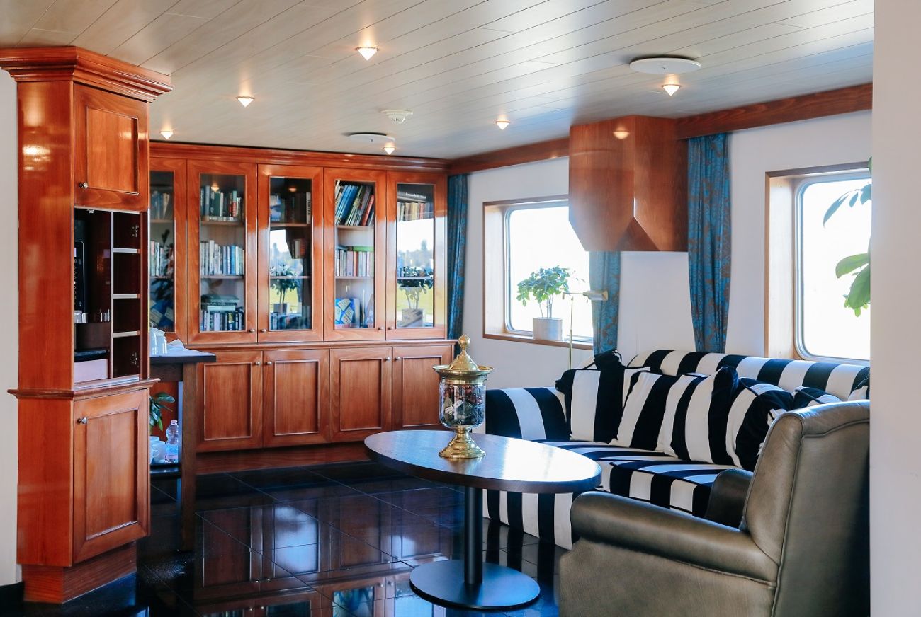 На разположение на гостите са ресторант, бар, зона с камина и кресла, машина за кафе и чай на самообслужване през целия ден, библиотека, сауна и фитнес, слънчева тераса със шезлонги, безжичен интернет срещу заплащане. Корабът разполага с 3 палуби, капацитетът е 110 гости.