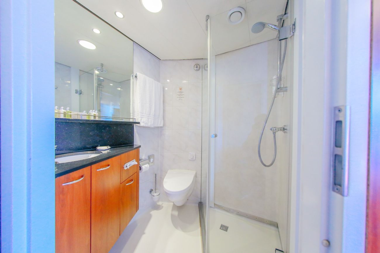 Каютите са с площ от 12.30 м2. Всички разполагат с индивидуален климатик, сателитна ТВ, сешоар, сейф, телефон, баня и тоалетна.